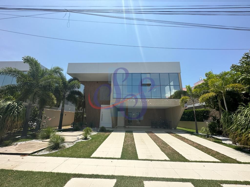 Casa duplex moderna com fachada toda no vidro no Alphaville Fortaleza, a casa possui 4 amplas suítes, pé direito duplo, escritório, dependência de empregada, varanda gourmet, cozinha com ilha, deck com churrasqueira, banheiro externo, piscina com raia, área construída 474m2, 6 banheiros, 3 vagas de garagem, terreno de 525m².